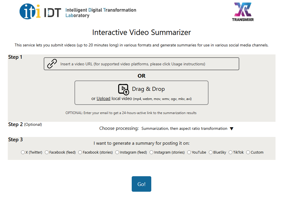 The landing page of the interactive summarization tool allows users to process video files up to 400 MB and 20 minutes in duration. The service accepts videos from YouTube, Facebook, Twitter, Instagram, Vimeo, DailyMotion, LiveLeak, and Dropbox, and supports the following formats: mp4, webm, mov, wmv, ogv, mkv, and avi.