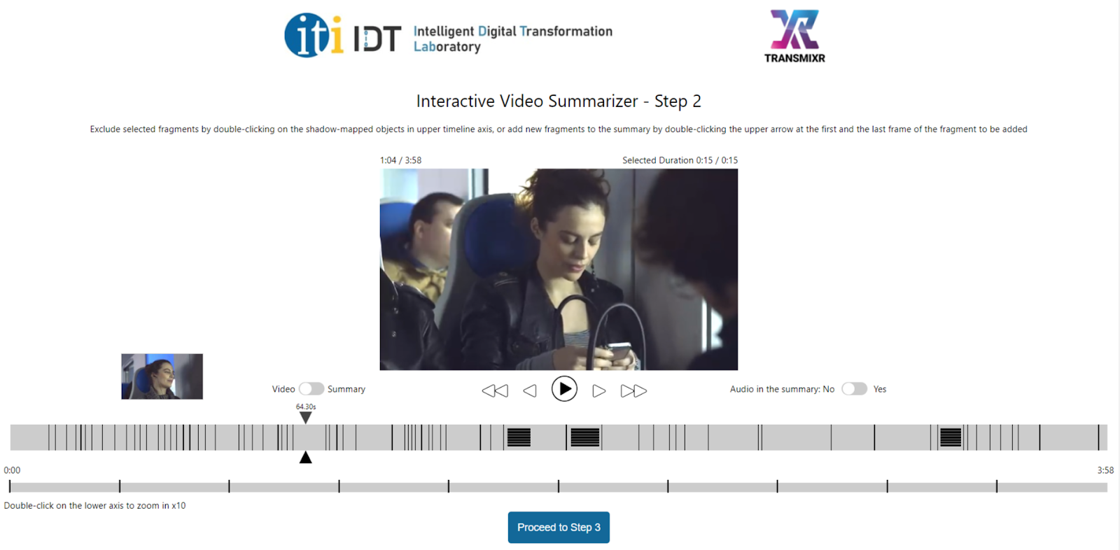 Timeline Axis. Segmented according to the selected video fragments from the previous step (Summarization), enabling quick navigation.