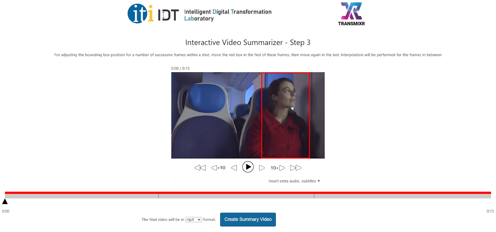 The CERTH Video Summarization API is responsible for the summarization of the videos. An online interactive video summarization service that allows users to submit videos in various formats, generate summaries for use in social media channels and refine the algorithm’s selected summary and aspect ratio transformation with just a few clicks, through interactive intermediate steps. You can access the tool to the following link: https://multimedia2.iti.gr/interactivevideosumm/service/start.html. The UI also includes links to video tutorials demonstrating how to use it.